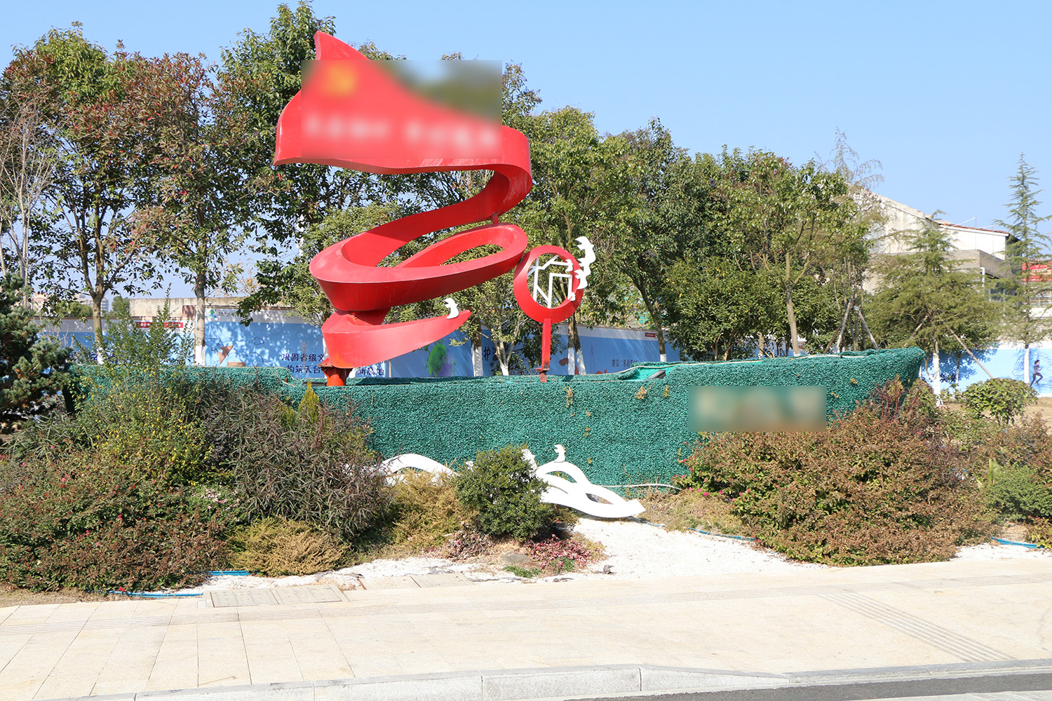 走近后觀看雕塑的底部為仿真植物米蘭葉的船身, 原本應(yīng)該墨綠色的葉片,經(jīng)過太陽曝曬已經(jīng)褪色嚴重,失去了光彩,對于其黨建宣傳的形象也是大打折扣。