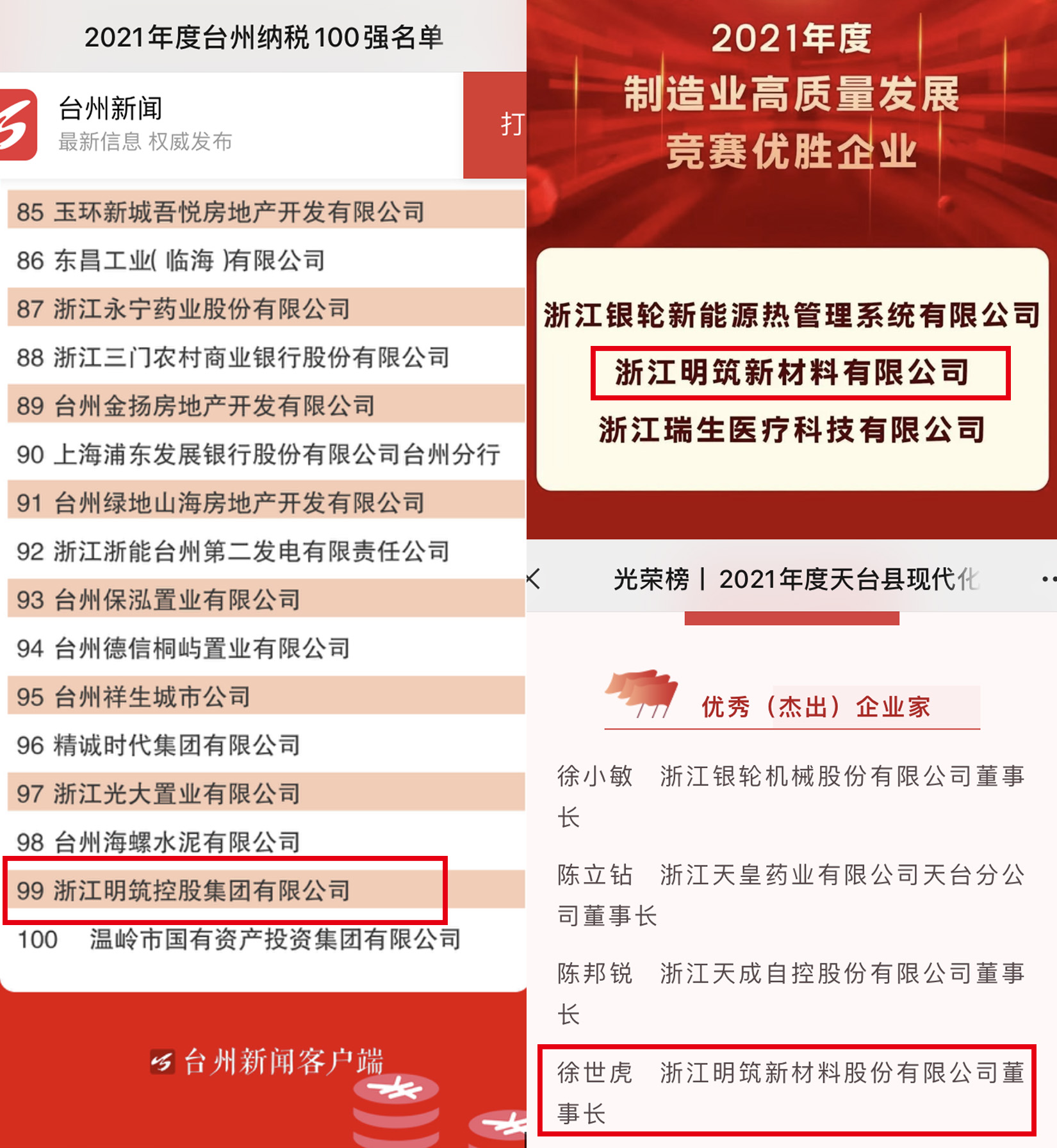 市2021年度制造業(yè)高質(zhì)量發(fā)展競(jìng)賽優(yōu)勝企業(yè),董事長(zhǎng)徐世虎也獲得天臺(tái)縣2021年優(yōu)秀企業(yè)家稱(chēng)號(hào)。